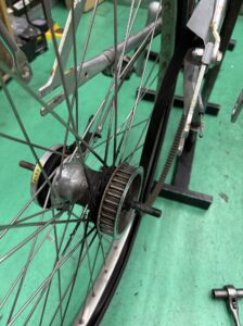 どれだけ時間がかかっても、フレームを守るために一つ一つ丁寧に部品を外して、正しい手順でタイヤ・チューブ交換を行っています。