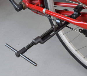 この工具は後輪を車体から外さず、フレームを無理やり広げてタイヤやチューブだけを抜き取るという方法。